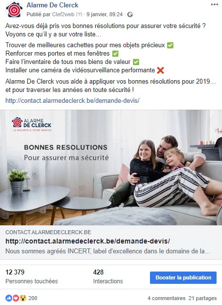 L’équipe de Clef2web se sent davantage en sécurité depuis qu’elle gère la stratégie webmarketing d’Alarme De Clerck, expert en détection d’intrusion et d’incendie. Située à Namur et Charleroi, la société s’occupe du placement et de l’entretien de votre système d’alarme. Elle propose également des caméras de surveillance analogiques ou IP et des détecteurs de fumée. Actifs depuis 1983, ces Security Experts vous accompagnent de A à Z pour assurer la protection de votre habitation.
